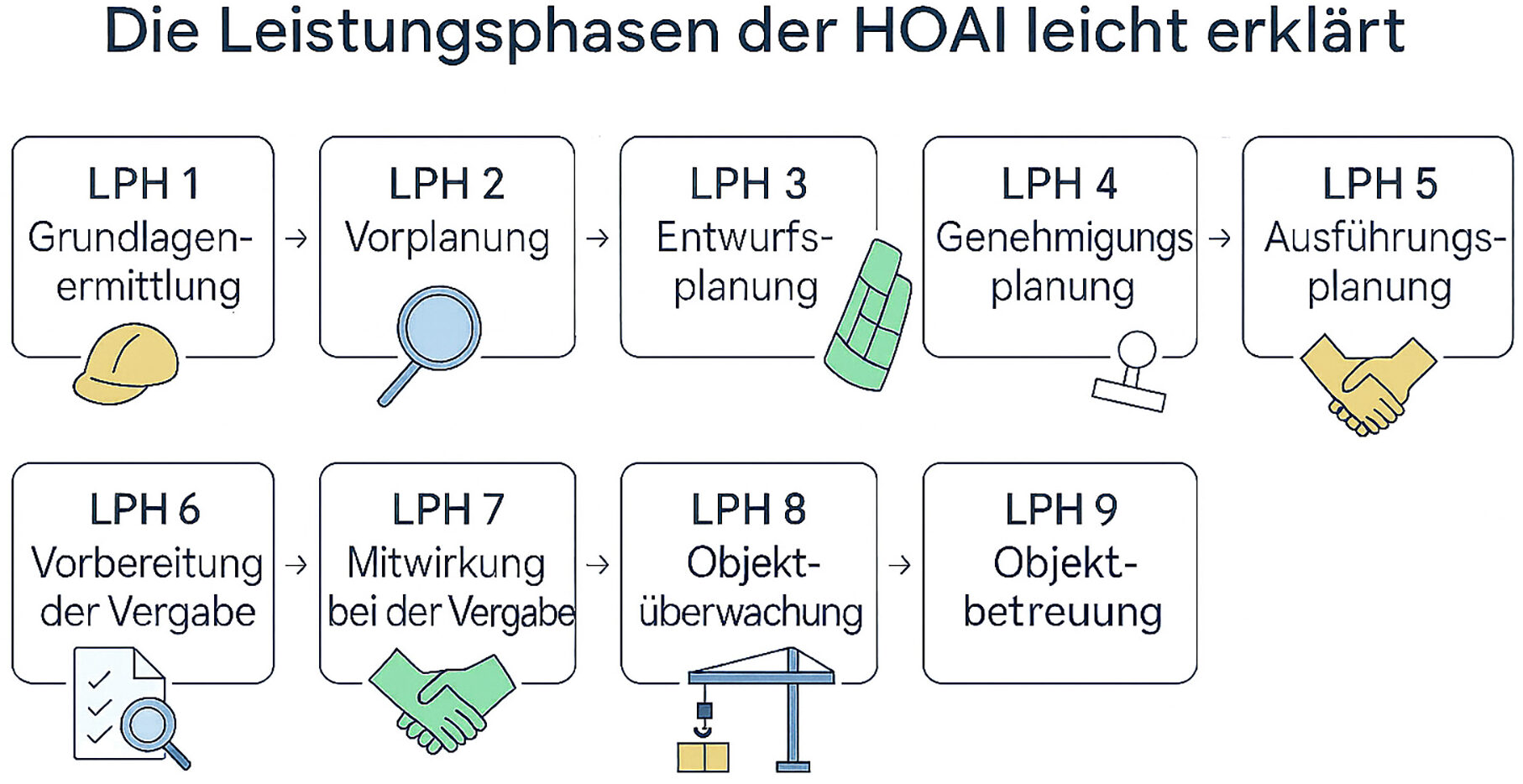 Die HOAI strukturiert ein Bauprojekt bzw. die Zusammenarbeit zwischen Bauherren und Architekten in 9 klar definierte Leistungsphasen und bildet auch die Basis unserer Leistungsbausteine.