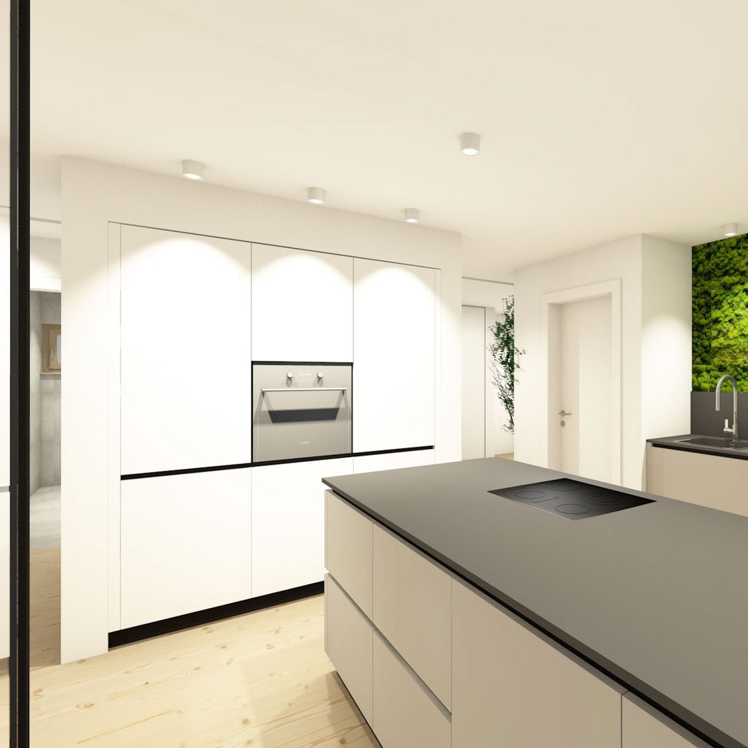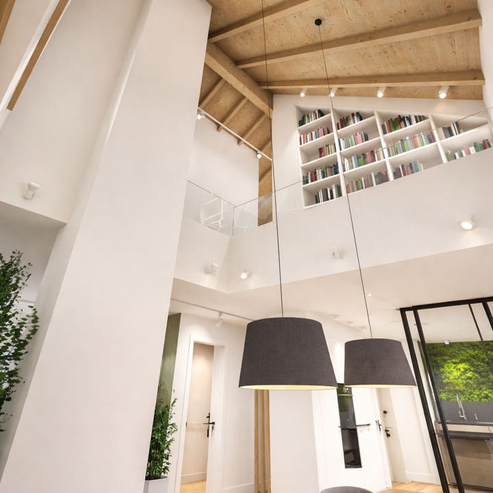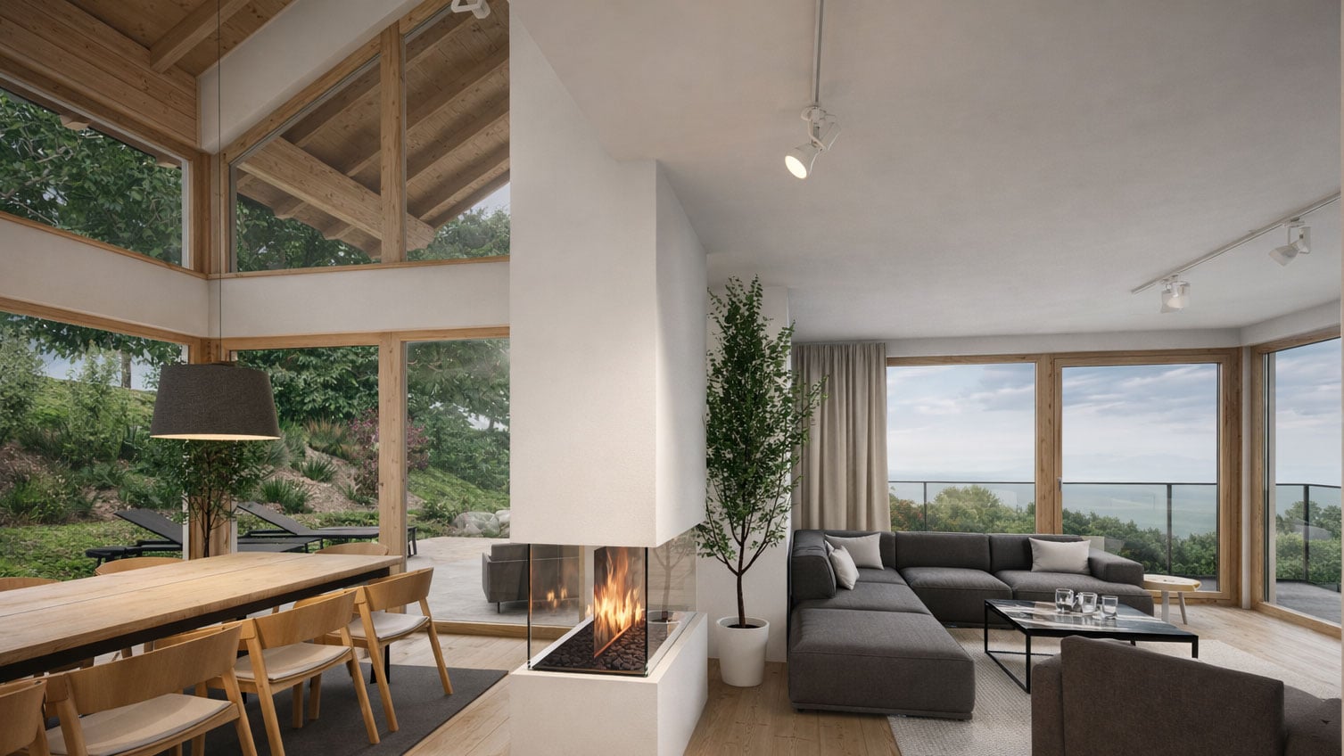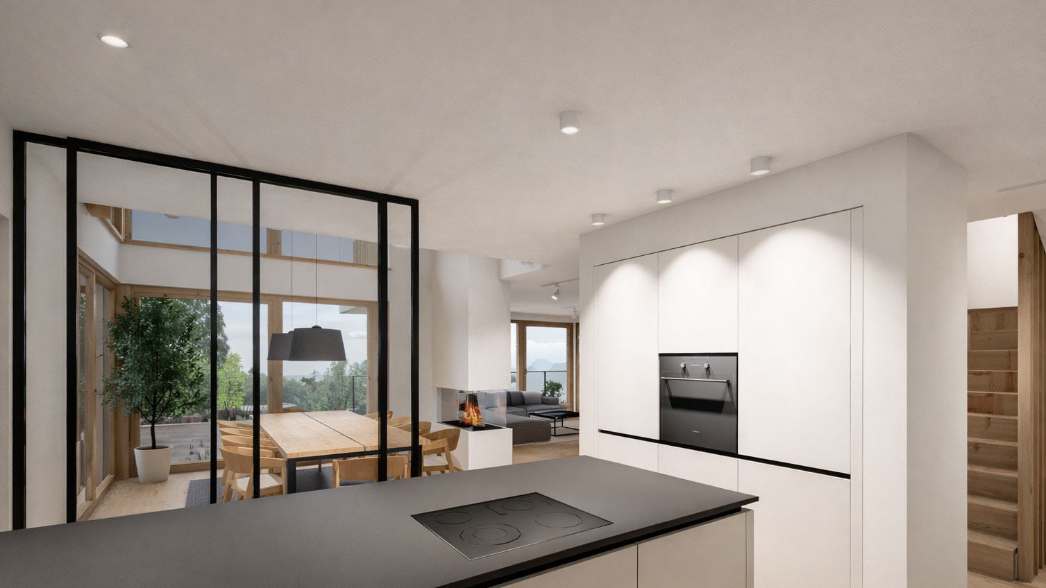 Natürliche Materialien, sichtbare Holzbalken und großzügige Raumhöhen prägen die Atmosphäre. Küche, Essen und Wohnen gehen fließend ineinander über und bilden ein offenes, kommunikatives Zentrum mit starkem Bezug nach außen.