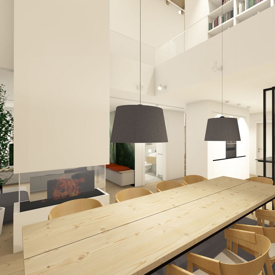Die Grundrissstruktur wurde konsequent auf Großzügigkeit und Nutzungsqualität ausgelegt. Das Esszimmer öffnet sich über zwei Ebenen nach oben und wird durch sichtbare Holzbalken gefasst.