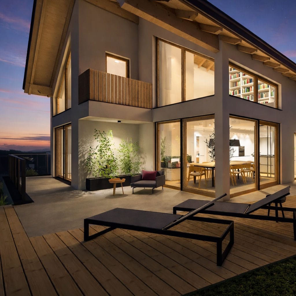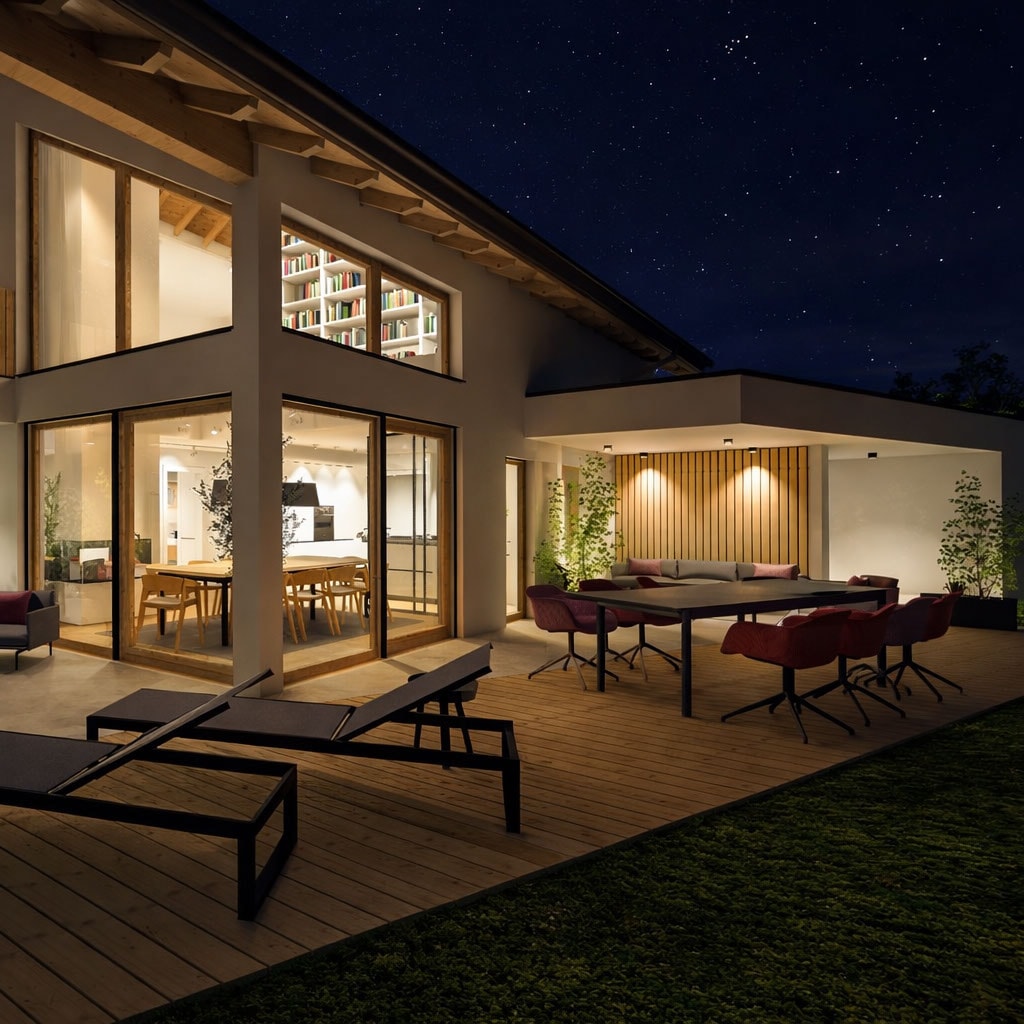 Ein besonderer Fokus lag auf den Übergängen zwischen Innen und Außen: Die große, überdachte Terrasse erweitert den Wohnraum und ist als geschützter Aufenthaltsort auch in Herbst und Winter nutzbar.