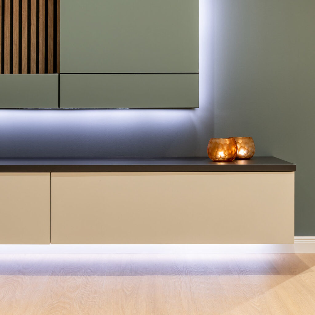 Matte Oberflächen in warmen, gedeckten Farbtönen mit natürlichen Holzakzenten betonen den wohnlichen Charakter, während integrierte Lichtlösungen Akzente setzen und die Möbel schwebend wirken lassen.