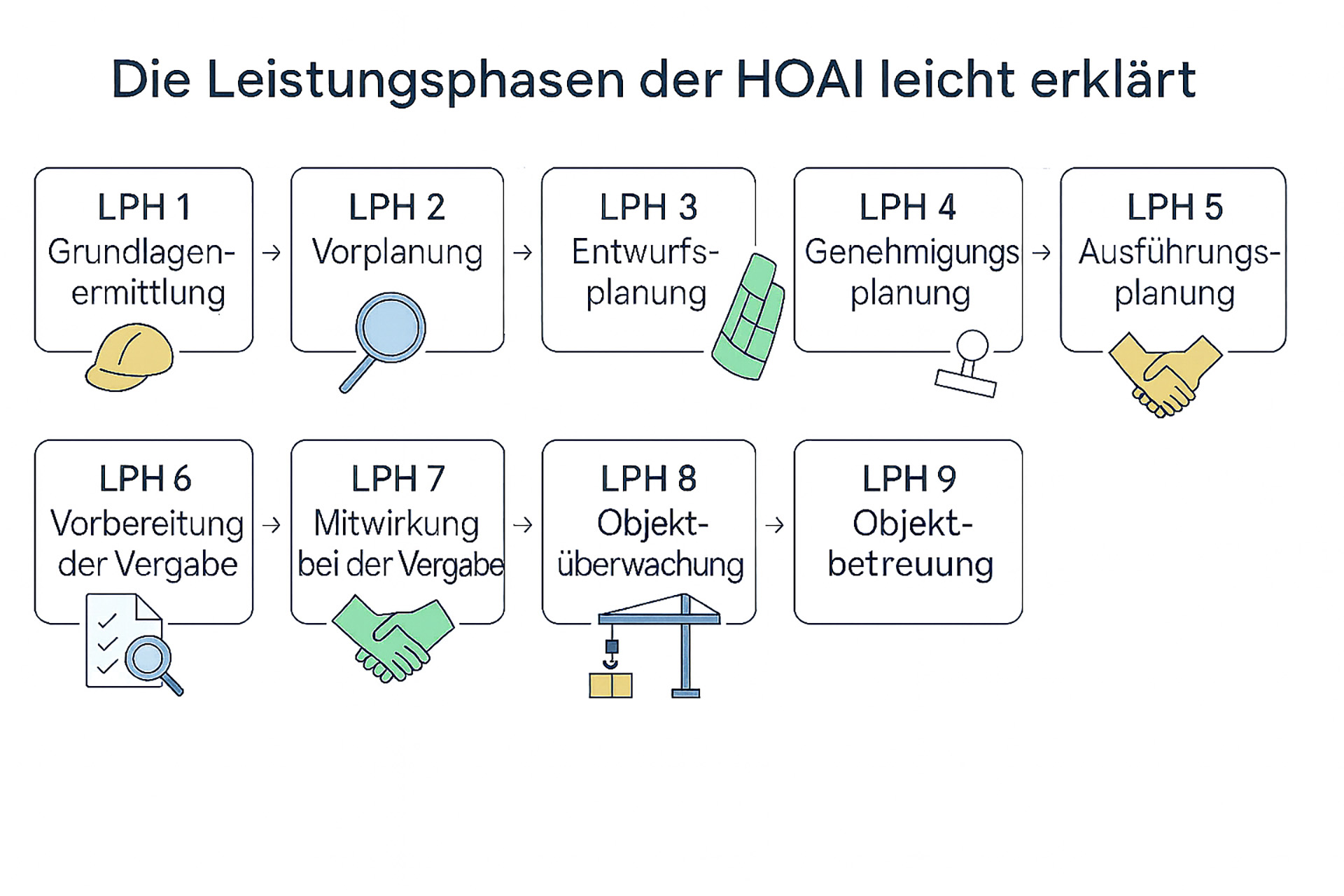 Die HOAI strukturiert ein Bauprojekt bzw. die Zusammenarbeit zwischen Bauherren und Architekten in 9 klar definierte Leistungsphasen, an denen sich auch unsere Leistungsbausteine der Architektur und Innenarchitektur orientieren.